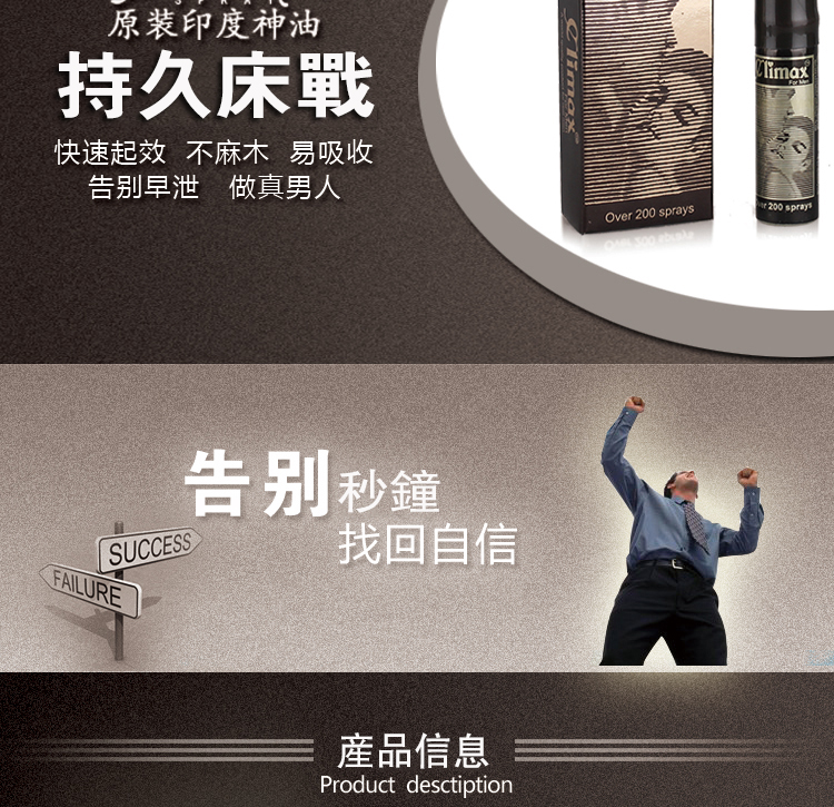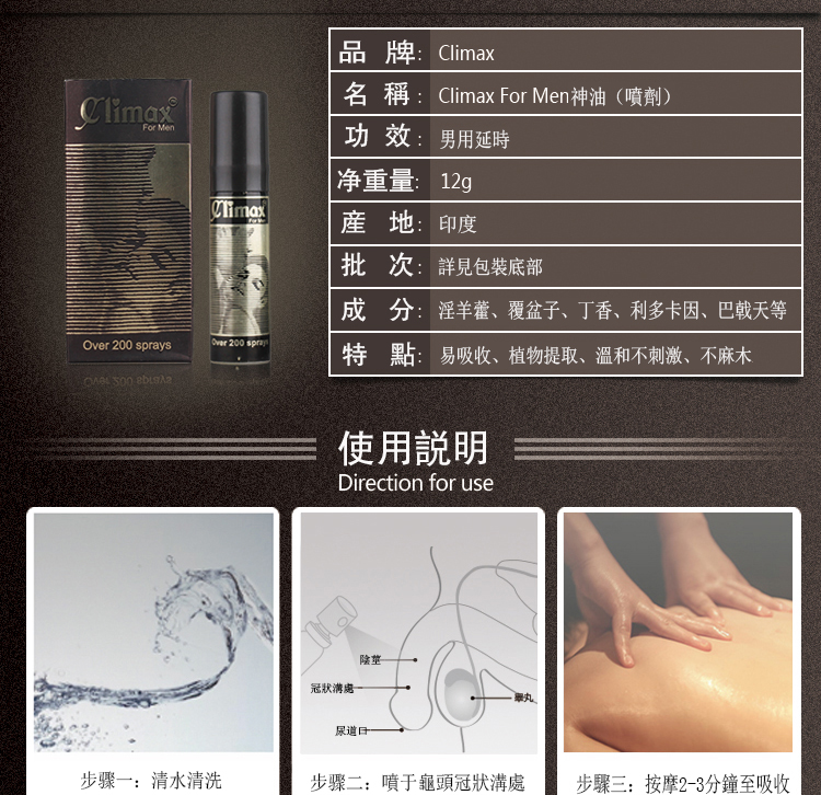 Climax印度神油巔峰極限,打破時間,climax印度神油讓你再也不受時間的約束,盡情瘋狂直達巔峰高潮! climax延時噴劑選用植物萃取,使用安全可靠,而且無需等待,快速起效,讓你告別早洩,持久延時!